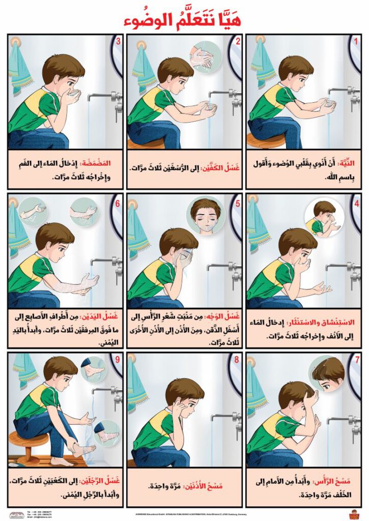 يعرض خطوات الوضوء بشكل مرتب وواضح، مع رسومات توضيحية مبسطة وشروحات تناسب الأطفال، ليتمكنوا من التعلم خطوة بخطوة بثقة وسهولة.